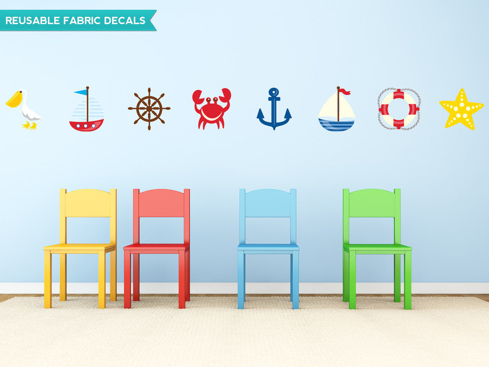 he beautiful nautical wall decals are made from a high quality fabric material that is non toxic and easy to use. Comes in a set of 8 fabric decals and include the following: two sailboats, crab, anchor, starfish, ship wheel, pelican, and a lifesaver.