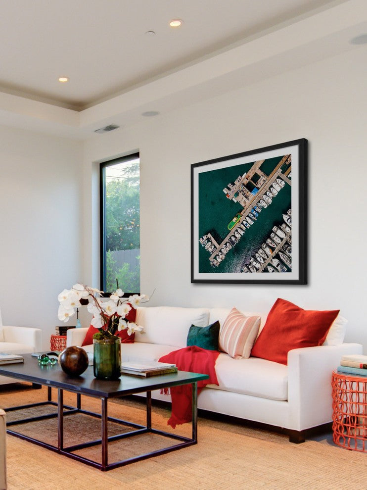 "Neatly Docked Boats" Framed Print by Karolis Janulis features vivid tones and supple artistry. Mounted in a gorgeous frame, this 24 inch wide by 24 inch tall piece will be an exceptional addition to any room. Top quality Giclee print on high resolution Archive Paper Artwork by Karolis Janulis Professionally framed and mounted on acid free archive matte High quality durable non-warping frame Arrives ready to hang Includes a certificate of authenticity Made in the USA
