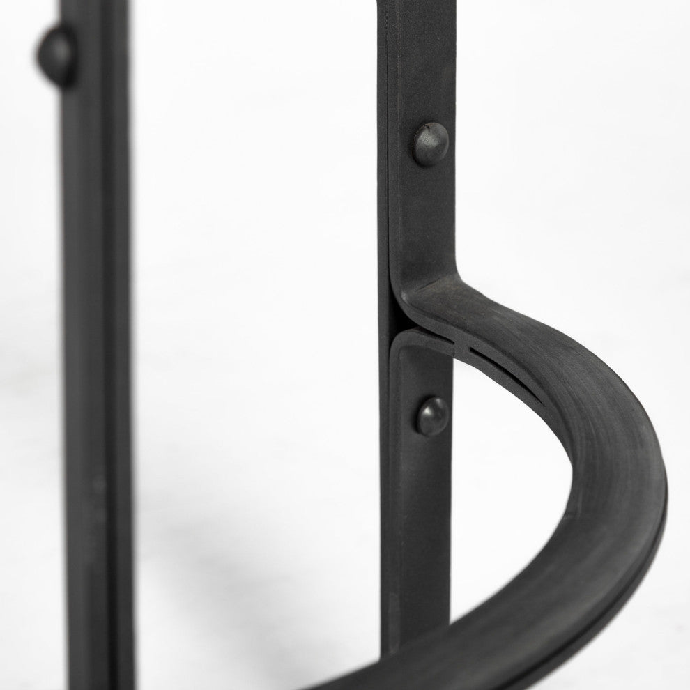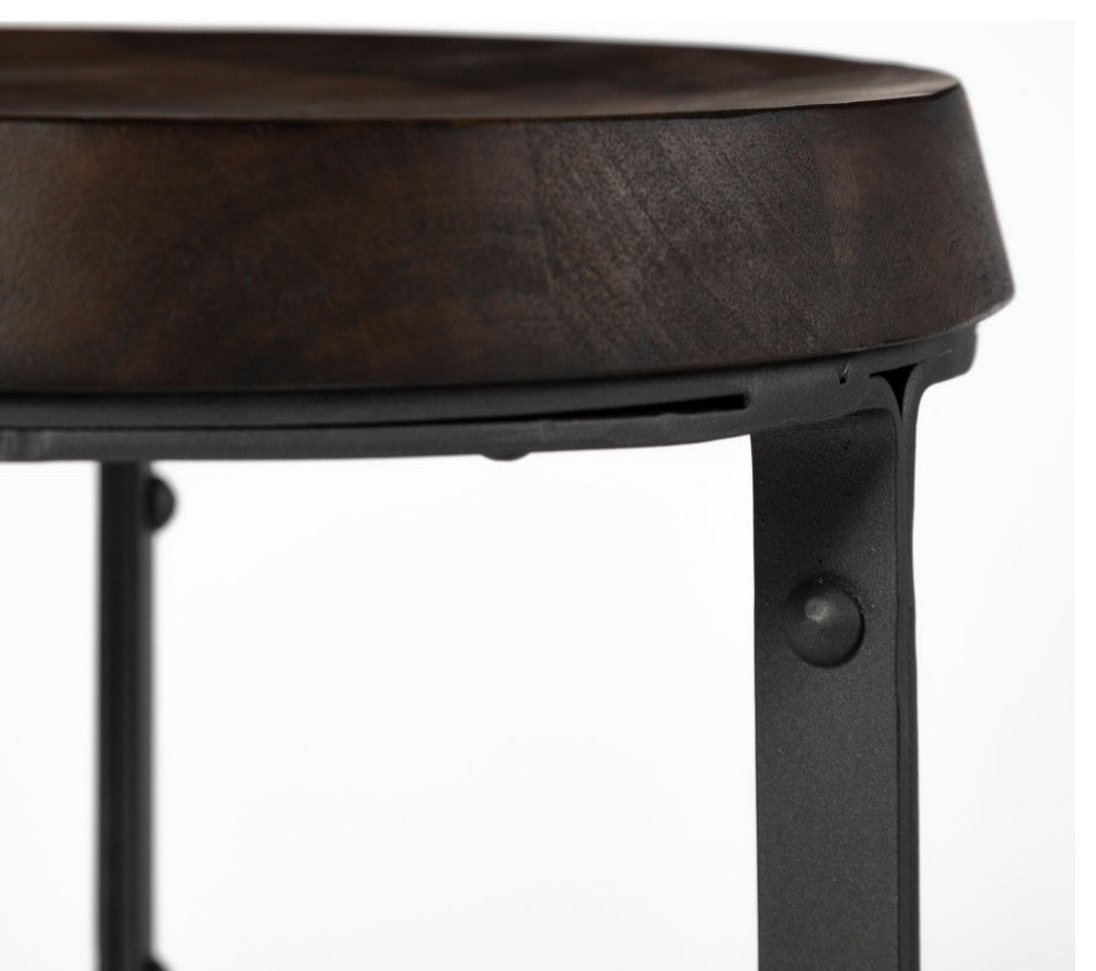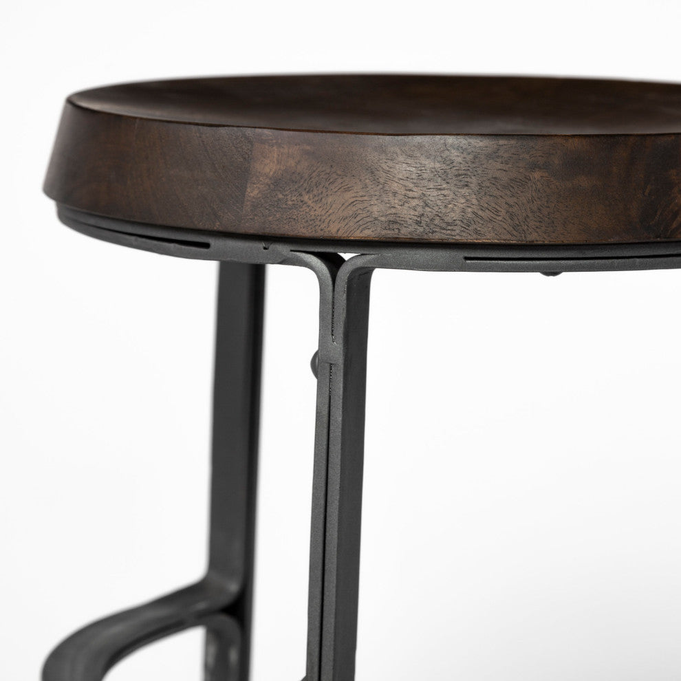 Featuring a round, contoured seat made from dark-stained solid Indian mango wood, The Neo II is a stunning counter-height stool. The solid wood seat is mounted on a uniquely designed iron base finished in a matte black tone. The Neo II, when paired with the right pieces, fits great in spaces based on the Industrial and Woodlands design styles. 26.3" Seat Height Bar StoolAt 15.5" long, 15.5" wide and 26" tall, the Neo II is a stylish seating option that pairs well with most standard-sized kitchen counters. Superior FinishIn addition to sturdy construction, the Neo II also flaunts a superior, matte-black polish on the metal frame that is complemented by the dark brown polished, round wooden seat, and adds to the visuals of this piece. Solid Metal FrameFeaturing a circular frame and base crafted from solid metal, the Neo II is a sturdy, cylindrical counter stool with exceptional stability and balance. FootrestThe base of the Neo II is equipped with metal rungs that not only reinforce stability but also serve as a footrest and ensure comfort. Modern DesignPrudently designed to suit contemporary spaces, the Neo II flaunts a round contoured seat which perfectly complements its circular metal frame. The juxtaposition of solid wood and metal makes this a great piece for contemporary spaces. No Assembly RequiredDelivered pre-assembled, the Neo II is ready to turn heads in your space as soon as it arrives at your doorstep.