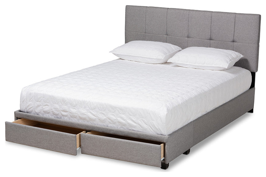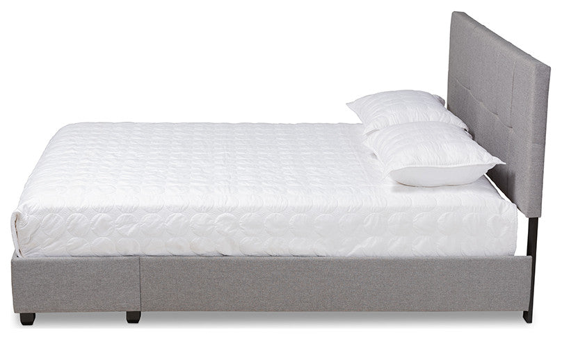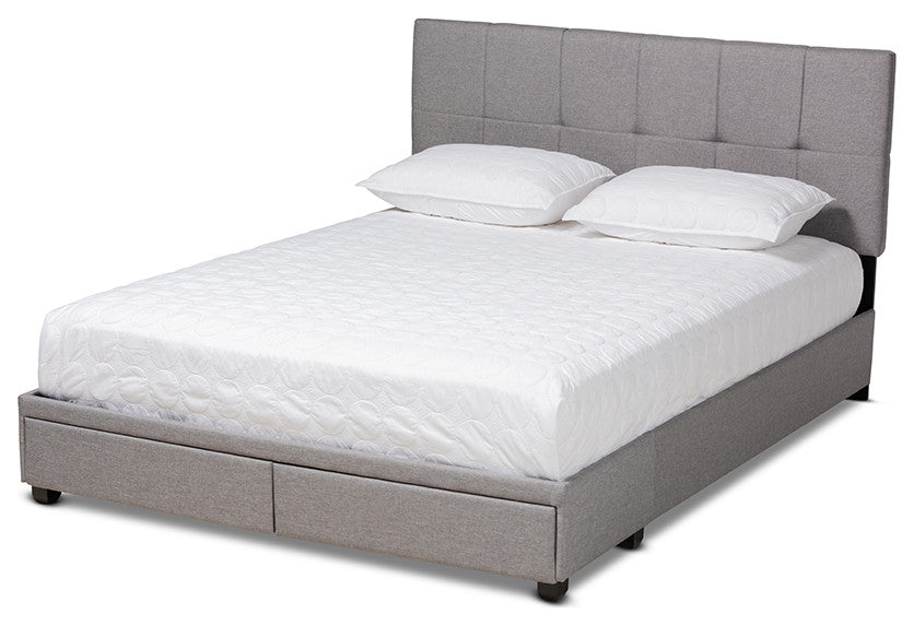 Baxton Studio Netti Light Grey Fabric Upholstered 2-Drawer Queen Size Platform Storage BedBaxton Studio Netti Light Grey Fabric Upholstered 2-Drawer Queen Size Platform Storage Bed-Reinvent your bedroom with the modern elegance of the Netti bed. This chic bed is upholstered in an elegant linen-like fabric that provides ample comfort for you to lean against as you read or watch TV. Biscuit tufting and black feet lend a clean, contemporary look. Stylish and practical, the Netti is fitted with two drawers at the footboard with space to store clothes, sheets, and more. The Netti bed is made in Malaysia and requires assembly.Constructed from MDF wood, rubberwood, and LVLUpholstered in a linen-like polyester fabric and padded with foamTwo (2) drawers Biscuit tuftedBlack feet Slats eliminate the need for a box springAssembly requiredDimensions: 46.26" high x 84.65" wide x 64.37" deep; Headboard: 24.41" wide x 64.37" long x 2.76" thick; Distance between slats: 5.98"; Height from floor to top of slat: 10.63" high; Legs: 2.36" high; Drawers: 30.55" wide x 18.5" deep x 5.31" high; Inside dimensions (mattress size): 60" wide x 80" deepOne (1) Queen Size BedBiscuit TuftingCare Instruction:Spot CleanAssembly RequiredIncludes: One (1) Queen Size BedIs this a Set? NoFull Dimension: Dimensions: 46.26" high x 84.65" wide x 64.37" deep; Headboard: 24.41" wide x 64.37" long x 2.76" thick; Distance between slats: 5.98"; Height from floor to top of slat: 10.63" high; Legs: 2.36" high; Drawers: 30.55" wide x 18.5" deep x 5.31" high; Inside dimensions (mattress size): 60" wide x 80" deepColors & Finishes: Light Grey/Black