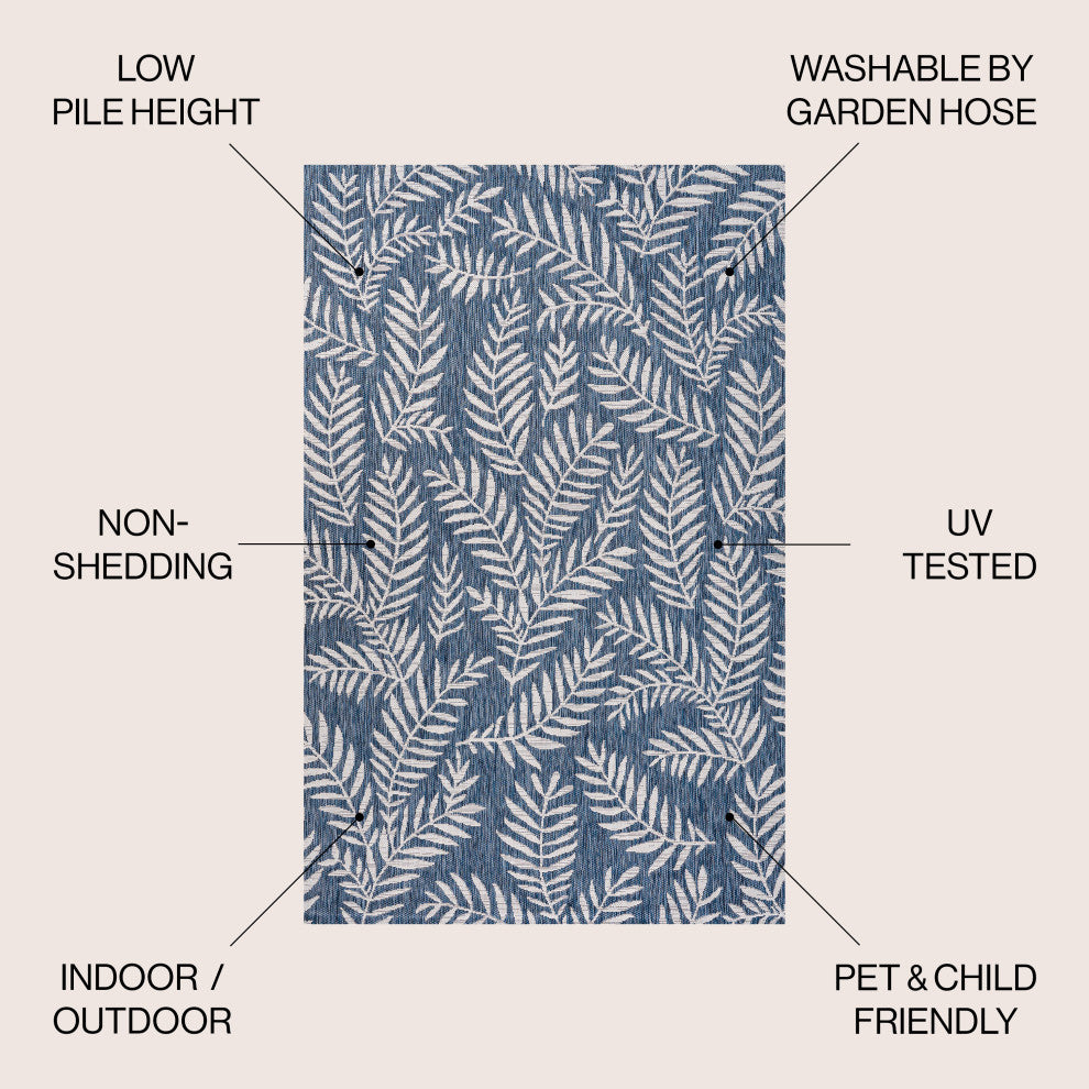 Whether you live in a tropical beach retreat or just love jungalow style, the allover palm frond pattern of this rug brings the jungle home. Scattered palm tree branches create graphic contrast in rich navy and cream tones. The busy pattern is perfect for your tropical patio, entry, kitchen, hallway, living room or bedroom. The pet-friendly and kid-proof flatweave design makes it easy to clean, and perfect for the beach house.
