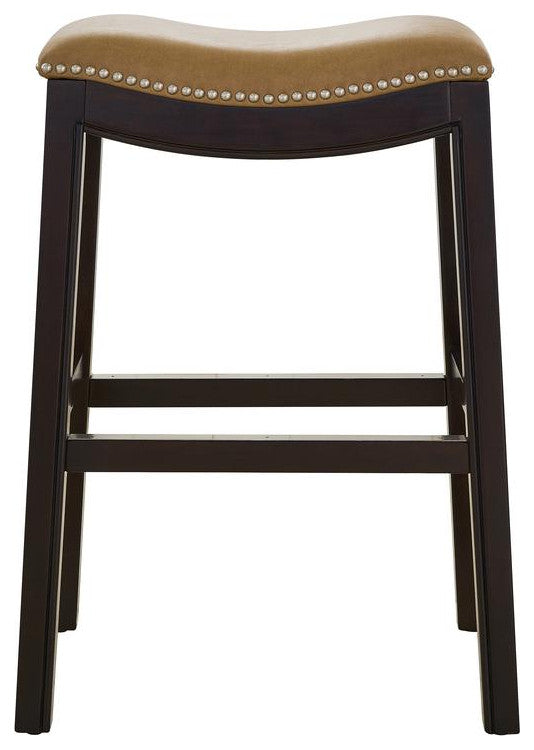 New Ridge Home Goods Julian Counter Height Barstool With Tan Faux Leather seatNR100124-PCS-EP New Ridge Home Goods Julian Counter Height Barstool With Tan Faux Leather seat, The Julian barstool blends sturdy solid wood contruction with old world nail head details, and a classic saddle seat to create a barstool that can fit into any dcor with ease. Solid wooden furniture is durable, sturdy and timeless. This is a counter height stool, 25 inches.