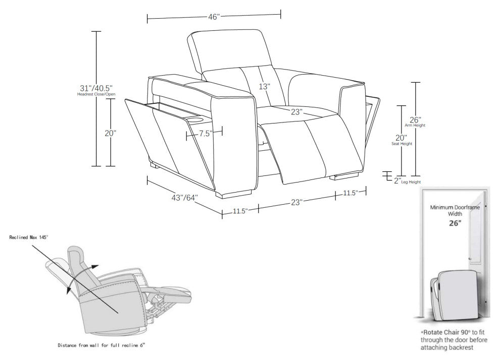 Enhance your living space with the luxurious Top Grain Italian Leather Armchair, offering the perfect combination of comfort, style, and modern functionality. This armchair features a power reclining seat, power headrest, and lumbar support, providing ultimate relaxation with the simple touch of a button. Whether you"™re lounging, reading, or watching your favorite show, you can easily adjust to your ideal position for maximum comfort.Crafted from Top-Grain Italian Leather, known for its durability, softness, and timeless elegance, this armchair adds sophistication to any room. The solid Brazilian wood frame ensures long-lasting strength and stability, making this chair a durable and stylish addition to your home.Designed with convenience in mind, the armchair also features hidden storage in each arm, providing a discreet space to keep small essentials like remotes, magazines, or other items you want close by, helping to maintain a clean, organized living area.Whether you''re outfitting your home theater, upgrading your living room, or creating a cozy reading nook, the Top Grain Italian Leather Armchair delivers luxurious comfort, thoughtful design, and convenient storage for an inviting and functional space.