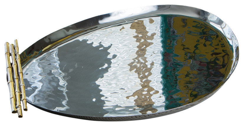 Add function to an ottoman or spruce up a console table with the Nickel and Bamboo Oblong Tray, shown here in gold. It features a stylish design that will refresh your space. This piece is made of iron and measures 17.5 by 13.25 inches.