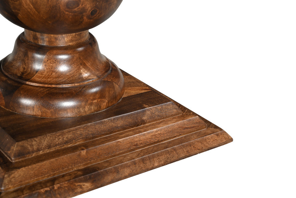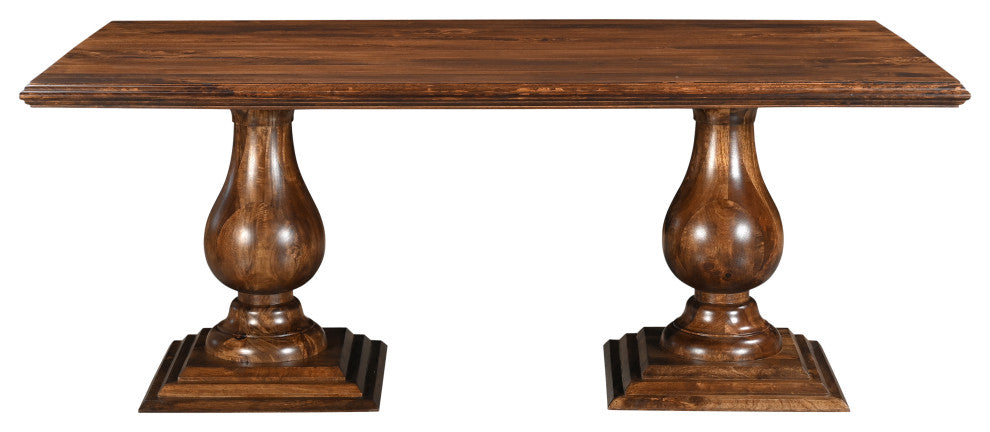 Elevate your dining room with this elegant dining set, showcasing a rectangular table with two intricately carved pedestals. The set includes stylish chairs with ladder backrests that offer both comfort and aesthetic appeal. The traditional style and neutral finish of this set make it an ideal addition to any home decor. Constructed from solid mango wood, each piece is built to last and maintain its beauty over time. This dining set blends classic elegance with solid craftsmanship, making every dining experience extraordinary.