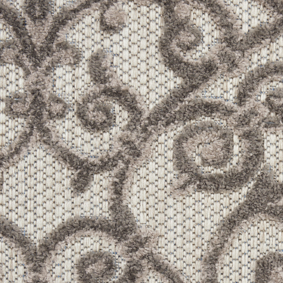 With its textural high-low style pile and scrolling floral design, this Aloha outdoor rug invites a sophisticated feel to your home. Tone-on-tone greys make for an elegant centerpiece for your patio or deck. Machine-made from premium stain-resistant fibers that are easily washable with a hose: simply rinse and allow both sides time to fully air dry. To extend the life of your rug, bring indoors during extreme weather.