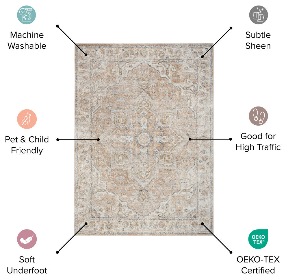 Vintage meets modern with this Persian rug from the Astra Machine Washable Collection. Featuring an artfully faded floral medallion pattern in beige, the classic design is enhanced with a brilliant sheen that shifts in tone under different lighting. This vintage-inspired rug is machine-washable for fuss-free cleaning, making it an ideal addition to busy households with pets and kids.