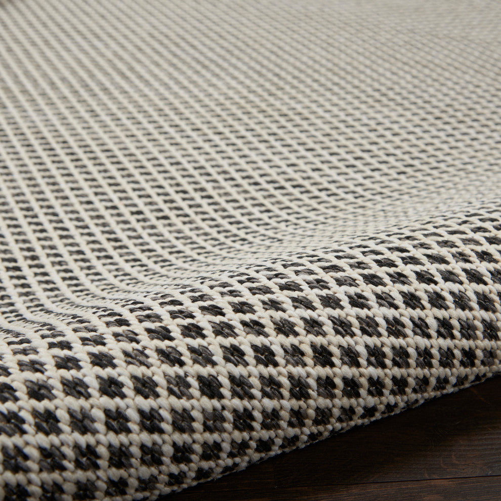 With its striking geometric pattern, this Courtyard Collection outdoor rug exudes contemporary style. Its subtly textured surface is crafted in classic ivory and charcoal grey for a seamless complement to modern settings. Machine made from a blend of polypropylene and polyester in a flatweave style that stands up to heavy traffic. Easily washable outdoors: just hose-rinse and air dry.