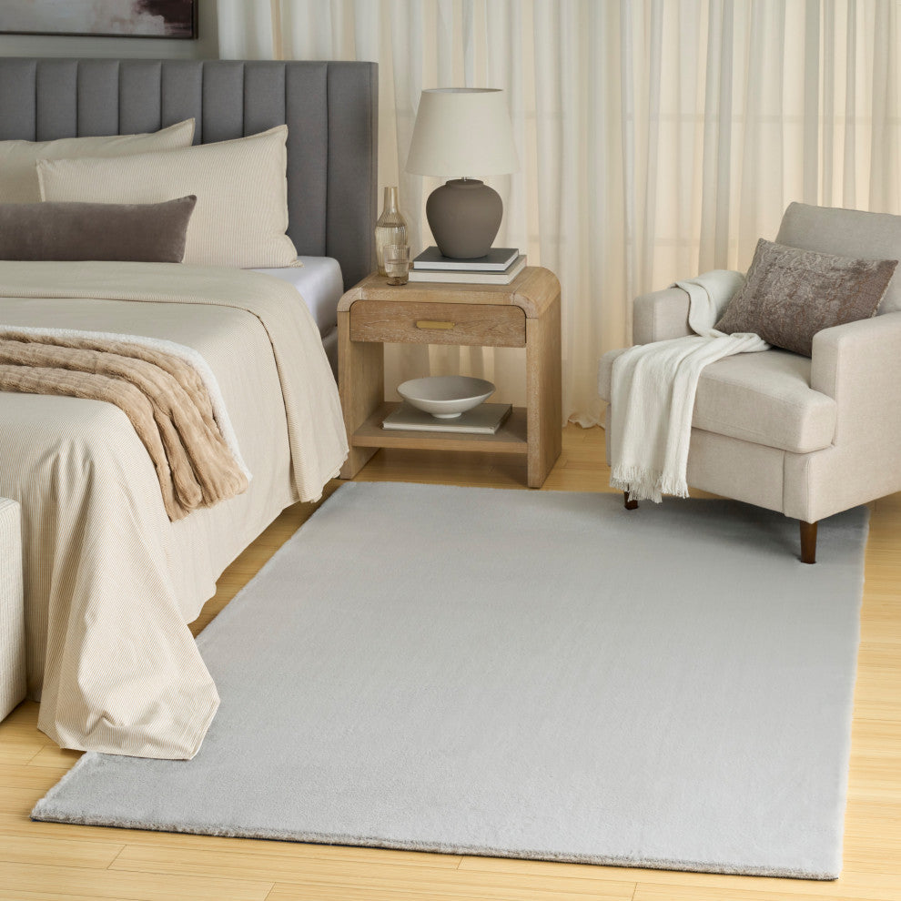 Transform your room with the irresistible comfort of this silver textured rug from the Soft Plush Rabbit Fur collection. The plush pile makes any room feel much more inviting '' perfect for any area in need of a cozy upgrade. This faux fur rug boasts a non-skid backing to keep it in place and is made from durable polyester fibers.