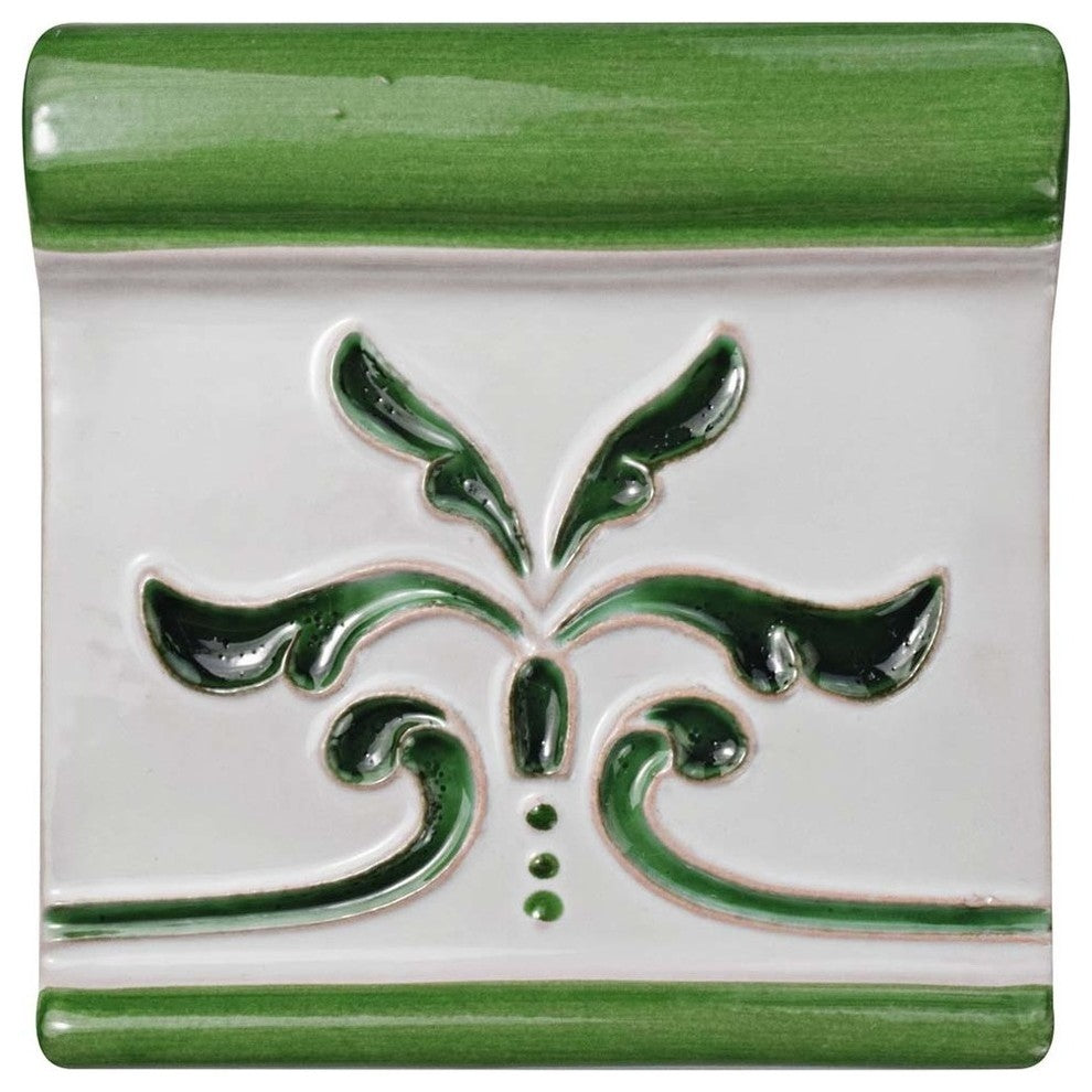 Capture a handcrafted, artisan appearance that is inspired by twentieth-century Spain with our Novecento Friso Evoli Verdin Ceramic Wall Trim Tile. Set on a milky hand-painted white glaze, the center floral design is sunken into the surface of the trim and has a crackle finish, giving it a dimensional feel. Spots of the red ceramic peek through the bisque glaze on the elevated designs, creating the authentic artisan look. The forest green color on the raised top and bottom borders is hand-painted and reminiscent of watercolor, offering a great accent for your wall installation. This glossy old-world tile is great for accenting other items in the Novecento program. Intended for interior wall use, this tile is an excellent selection to accent your backsplash, shower wall, fireplace facade or accent wall. It is necessary that you seal this tile before grouting to prevent the absorption of staining agents over time. Tile is the better choice for your space. This tile is made from natural ingredients, making it a healthy choice as it is free from allergens, VOCs, formaldehyde and PVC.