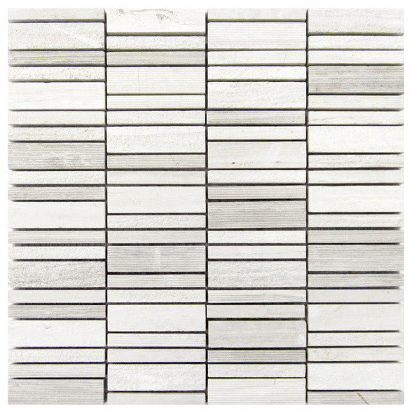 White Oak Hammered (Bush Hammered Finish) marble mosaic is rich with shades of cool and warm whites in a natural linear pattern echoing natural oak. The design pattern is 1" x 2" mosaics on meshed back. This marble is recommended for interior projects inc