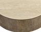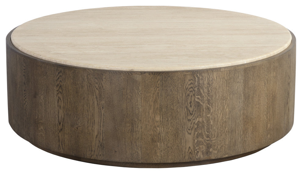 The simple round silhouette of the Oberon Coffee Table accentuates the inherent beauty of natural mixed materials for a versatile piece that will enhance any room. Handcrafted and finished by skilled artisans, this piece includes a solid travertine top and an oak veneer base with a solid oak wood edge. As travertine is a natural material, unique veining, pitting, fissures, micro-cracks and colour variations are all characteristics that add to the uniqueness and beauty of each piece. As wood is an organic, porous material, these pieces will contain natural variation of texture and may also exhibit fine indentations and cracks. Wood pieces will also display a disparity of colour and grain, and visible knots and burls that add to the character of each piece. Made in India. With refined craftsmanship, this design was brought to life by skilled local artisans. Due to the nature of handcraftsmanship, unique imperfections such as fissures, markings and variations in colour and shape are welcomed and appreciated characteristics for a truly one-of-a-kind piece.