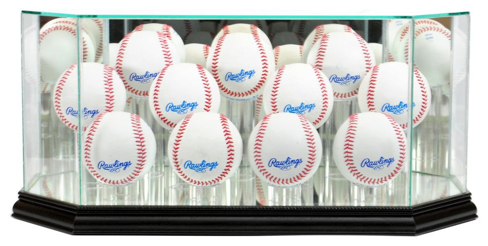 The 11-Ball Baseball octagon display case from Perfect Cases comes with mirror on the bottom and back. This case is UV protect and is supported by Perfect Cases beautiful real wood moulding. Our adhesives contain no acids that may deteriorate signatures. This display case can hold between 10 and 12 autographed baseballs.