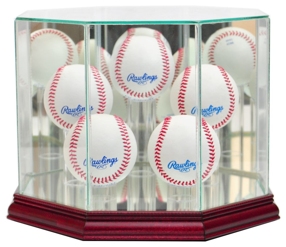 The 5 - Ball Baseball Octagon Display Case comes with mirror on the bottom and back to give a complete view of your autographed baseballs. This case is UV protect and is supported by beautiful real wood moulding. Our adhesives contain no acids that may deteriorate signatures. This case can hold between 4 and 6 autographed baseballs.