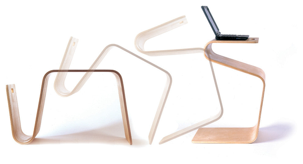 Description:The Offi Mag Table in Birch is a versatile modern table of a thick bent ply design. The organic curves and natural wood make it very appealing. It is designed as a multi-functional table to be used as a side table, magazine rack, or flip it for a laptop table. It has space for magazines in the curve, or flipped up for a workspace to place a laptop, or as a modern bench. The modern Mag table is extremely durable, high quality, and a classic bent ply design. The natural edge and beautiful wood veneers, along with the shapely curves has made the Mag table a mainstay in the modern home since 2001. Materials:Molded thin-ply in Baltic Birch Dimensions:26" W x 14" D x 16" High
