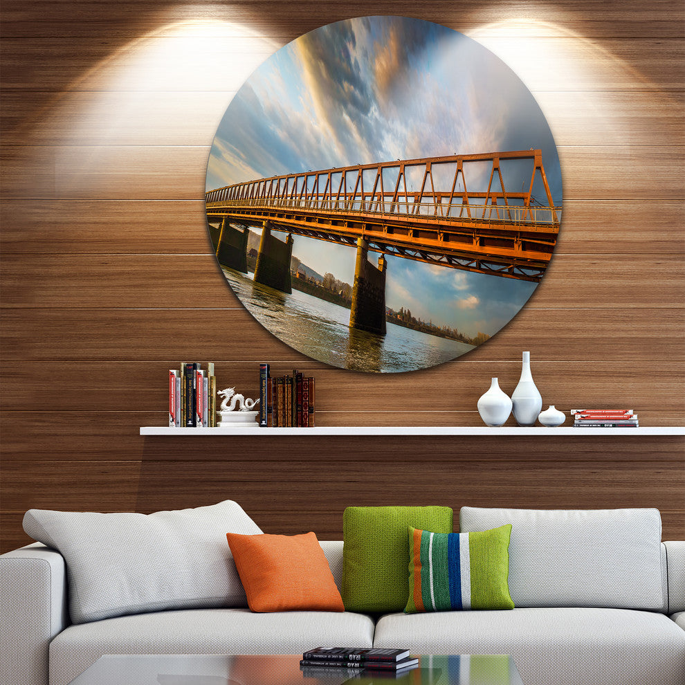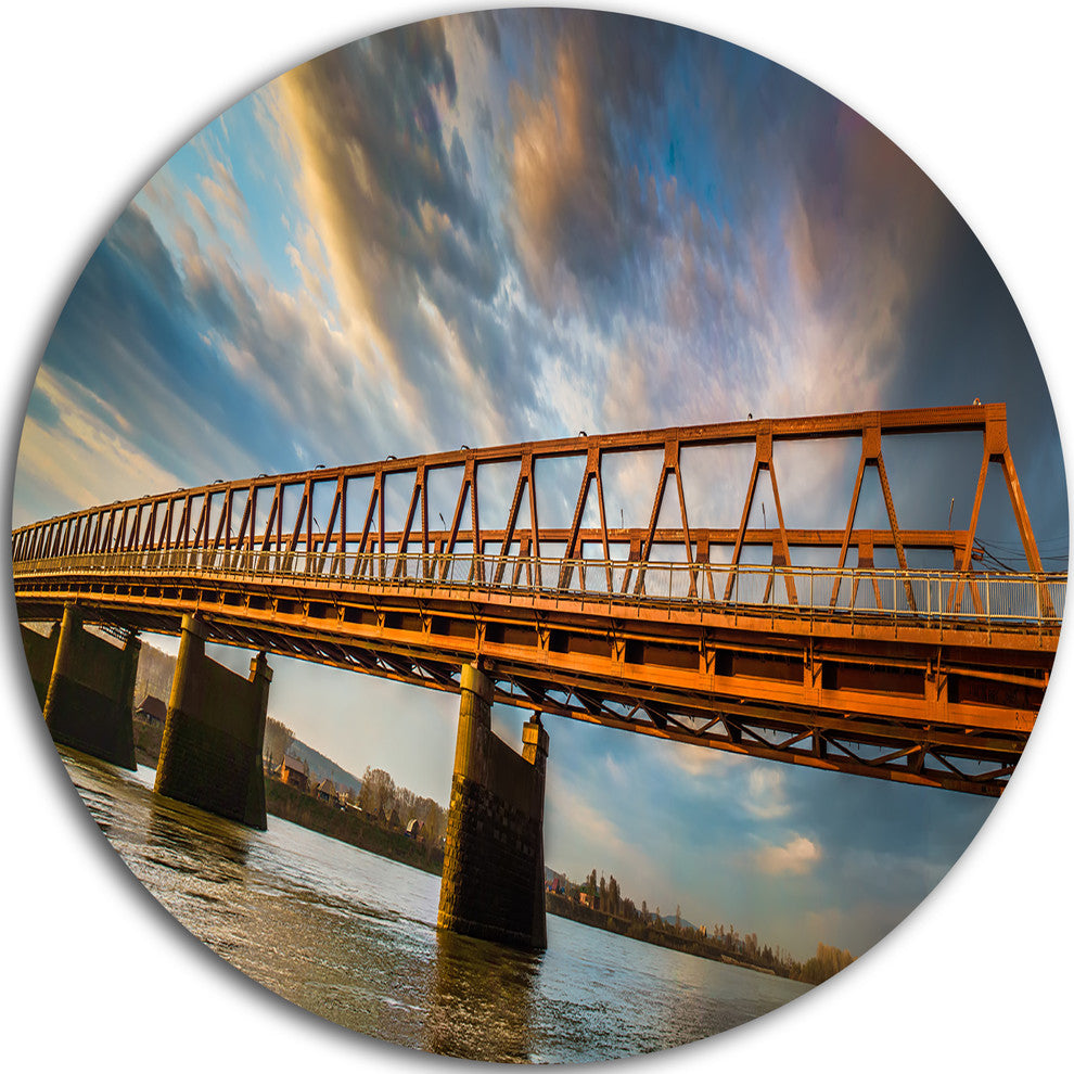 Bring Contemporary Abstraction to your home with this large Circle Metal wall art. This Old Bridge Over River on Cloudy Day Metal Artwork makes it the focal point of any room or office.