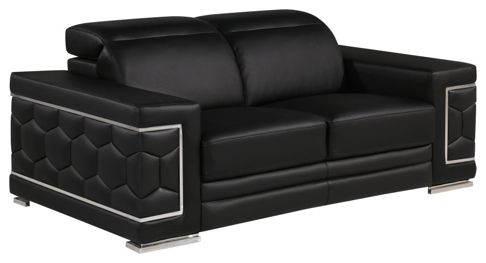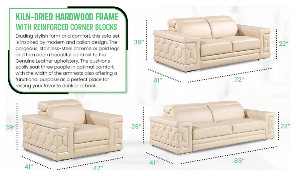 Exuding stylish form and comfort, this sofa set is inspired by modern and Italian design. The gorgeous, stainless steel chrome legs and trim add a beautiful contrast to the Genuine leather upholstery. The cushions easily seat three people in optimal comfort, with the width of the armrests also offering a functional purpose as a perfect place for resting your favorite drink or a book.