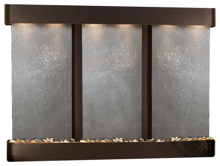The Olympus Falls water fountain by Adagio Water Features is a beautiful three panel water wall that comes in slate, marble, mirror, or FeatherStone. This wall water fountain is self-contained allowing you to place it anywhere there is a standard 110V outlet without needing a water source. Just pour water into your tray and the pump will cycle it through. Enjoy the calming effects of a water fountain in your home today.75" L x 54" H x 6" D, easy to hang, complete with colored instructions and hardware for hanging on a sheetrock wall. Hanging Weight 180 lbs.This unit includes: 6 halogen lights Polished river rocks 3 Electric pumps3-way pull chain that allows you to run just lights, just water, or lights and water. Welded plastic liner insures against leaking and unique water distribution unit system will not clog. 110V, 100W; one cord operates entire unit; 90 degree plug can be concealed behind water feature. Durable powder coat finish; Manufactured and assembled in the USA with a 1 year limited warranty. • This light-weight slate veneer known as FeatherStone is natural stone and therefore may differ in color and texture from the photos shown.