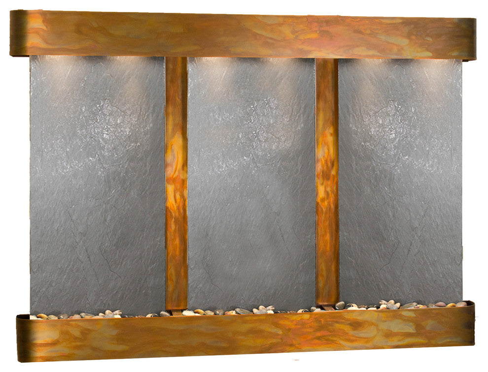 The Olympus Falls water fountain by Adagio Water Features is a beautiful three panel water wall that comes in slate, marble, mirror, or FeatherStone. This wall water fountain is self-contained allowing you to place it anywhere there is a standard 110V outlet without needing a water source. Just pour water into your tray and the pump will cycle it through. Enjoy the calming effects of a water fountain in your home today.75" L x 54" H x 6" D, easy to hang, complete with colored instructions and hardware for hanging on a sheetrock wall. Hanging Weight 180 lbs.This unit includes: 6 halogen lights Polished river rocks 3 Electric pumps3-way pull chain that allows you to run just lights, just water, or lights and water. Welded plastic liner insures against leaking and unique water distribution unit system will not clog. 110V, 100W; one cord operates entire unit; 90 degree plug can be concealed behind water feature. Durable powder coat finish; Manufactured and assembled in the USA with a 1 year limited warranty. • This light-weight slate veneer known as FeatherStone is natural stone and therefore may differ in color and texture from the photos shown.