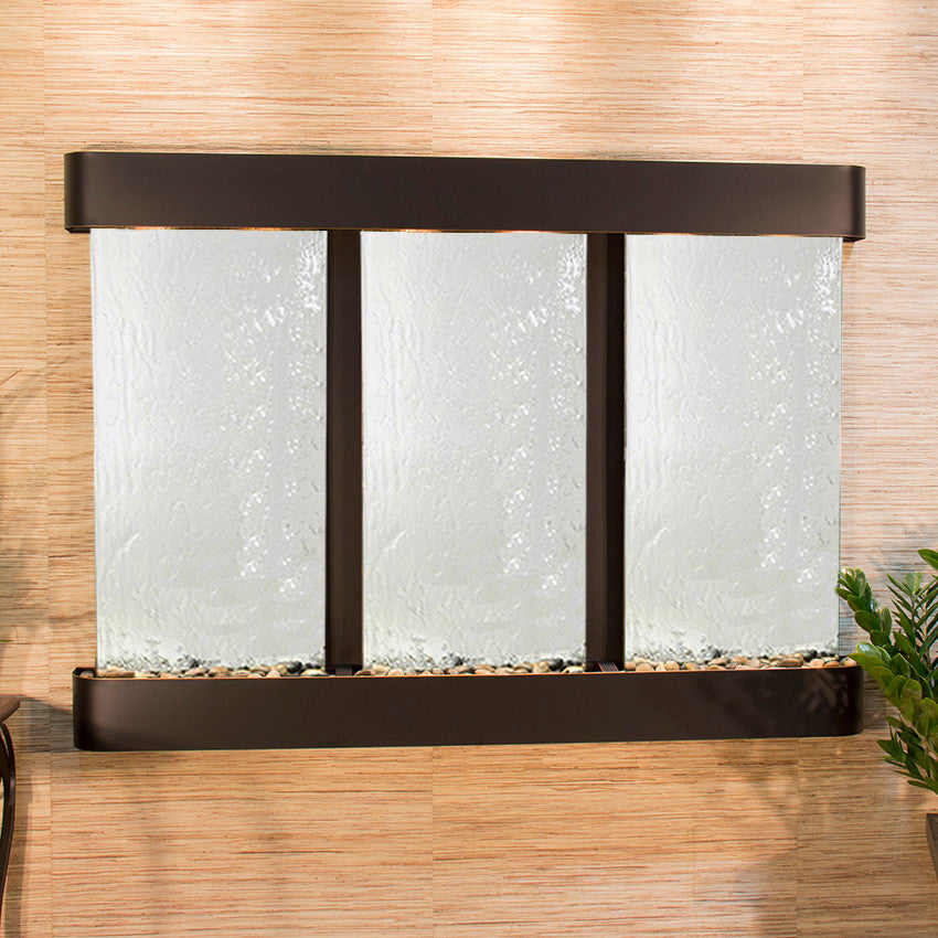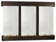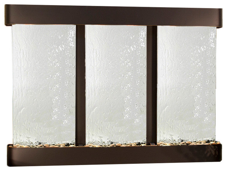 The Olympus Falls water fountain by Adagio Water Features is a beautiful three panel water wall that comes in slate, marble, mirror, or FeatherStone. This wall water fountain is self-contained allowing you to place it anywhere there is a standard 110V outlet without needing a water source. Just pour water into your tray and the pump will cycle it through. Enjoy the calming effects of a water fountain in your home today.75" L x 54" H x 6" D, easy to hang, complete with colored instructions and hardware for hanging on a sheetrock wall. Hanging Weight 240 lbs.This unit includes: 6 halogen lights Polished river rocks 3 Electric pumps3-way pull chain that allows you to run just lights, just water, or lights and water. Welded plastic liner insures against leaking and unique water distribution unit system will not clog. 110V, 100W; one cord operates entire unit; 90 degree plug can be concealed behind water feature. Durable powder coat finish; Manufactured and assembled in the USA with a 1 year limited warranty.