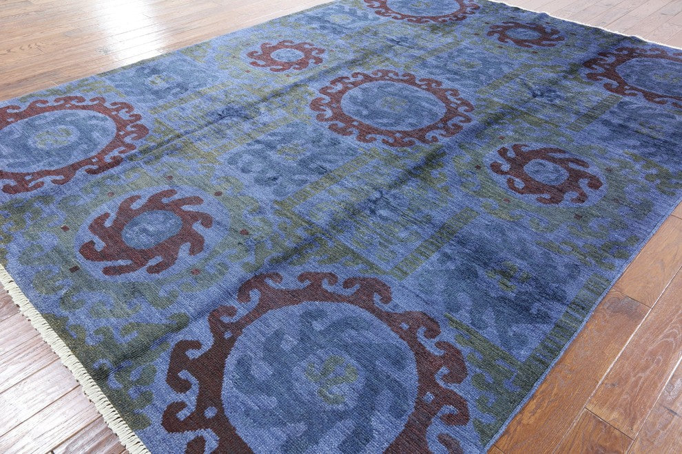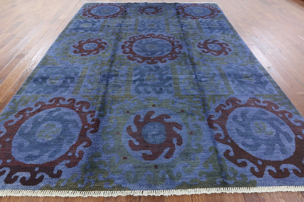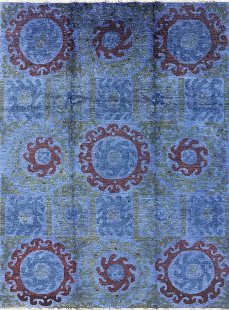One of a Kind Geometric Blue 9'x12' Overdyed Hand Knotted Wool Area Rug H8784