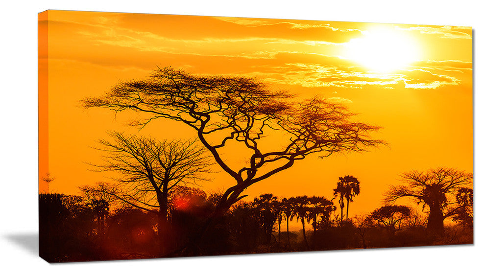 The Orange Glow of African Sunset canvas art print is sure to make an impression on anyone who sees it. This artwork is gallery wrapped around a 1-inch solid wood frame and arrives carefully packaged and entirely ready to hang on the wall. Design Art only uses the highest resolution and pigments to ensure a crisp colorful print that is never faded or pixelated. This artwork is sure to be a conversation starter in any home or office.