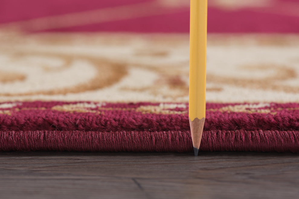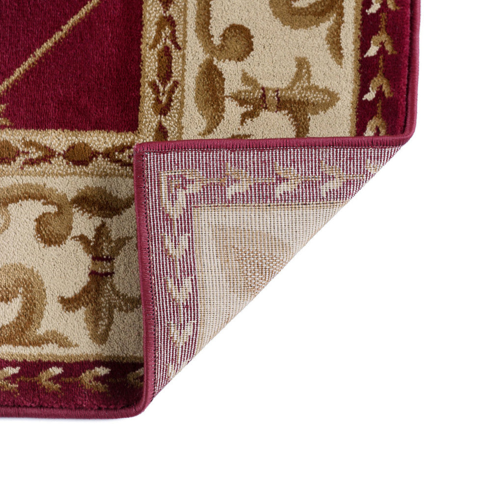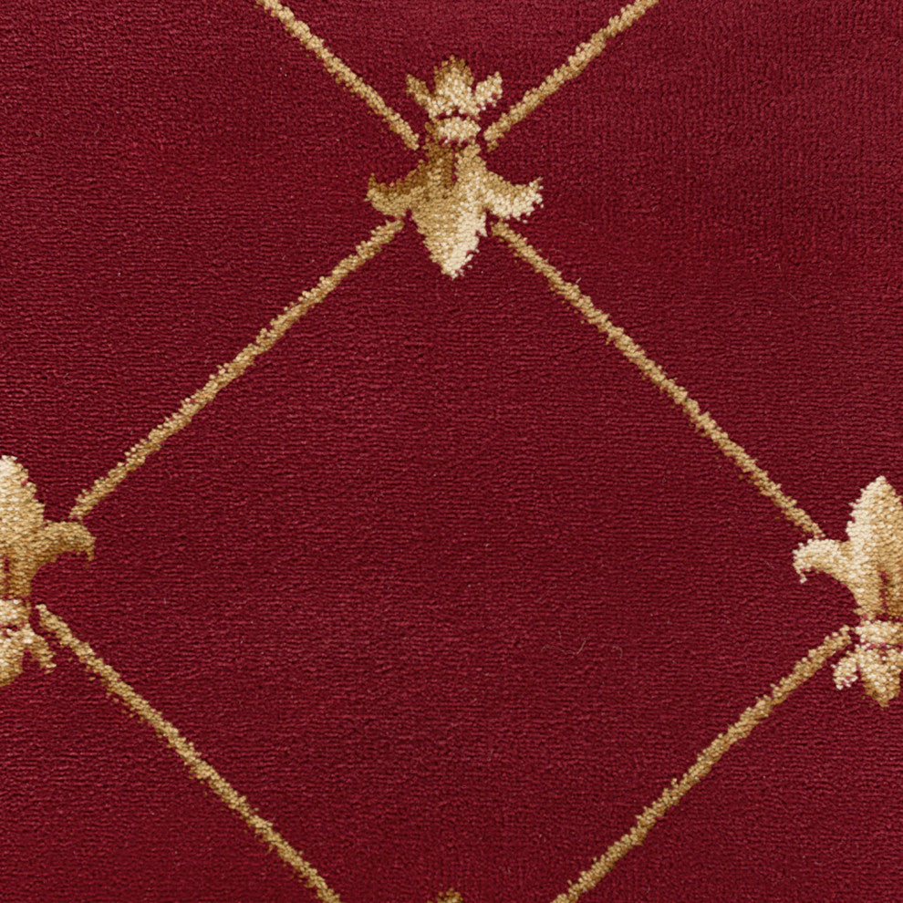 Blanket your floors in the traditional beauty of the Orleans Traditional Area Rug. This stunning rug features an intricate fleur de lis pattern with a scroll border in vibrant scarlet, fawn beige, bone ivory, and brass. Polypropylene fibers make this rug easy to care for and naturally stain-resistant perfect for high traffic areas, large kitchens or even under the family dining table.Care instructions: Vacuum to restore pile; spot clean with mild detergent and water when necessary; do not bleach.Color: RedMaterials: Power loom machine-made polypropyleneDimensions: W 8''9" x D 12''3"Please Note: Due to differences in computer monitors, some product colors may vary slightly.