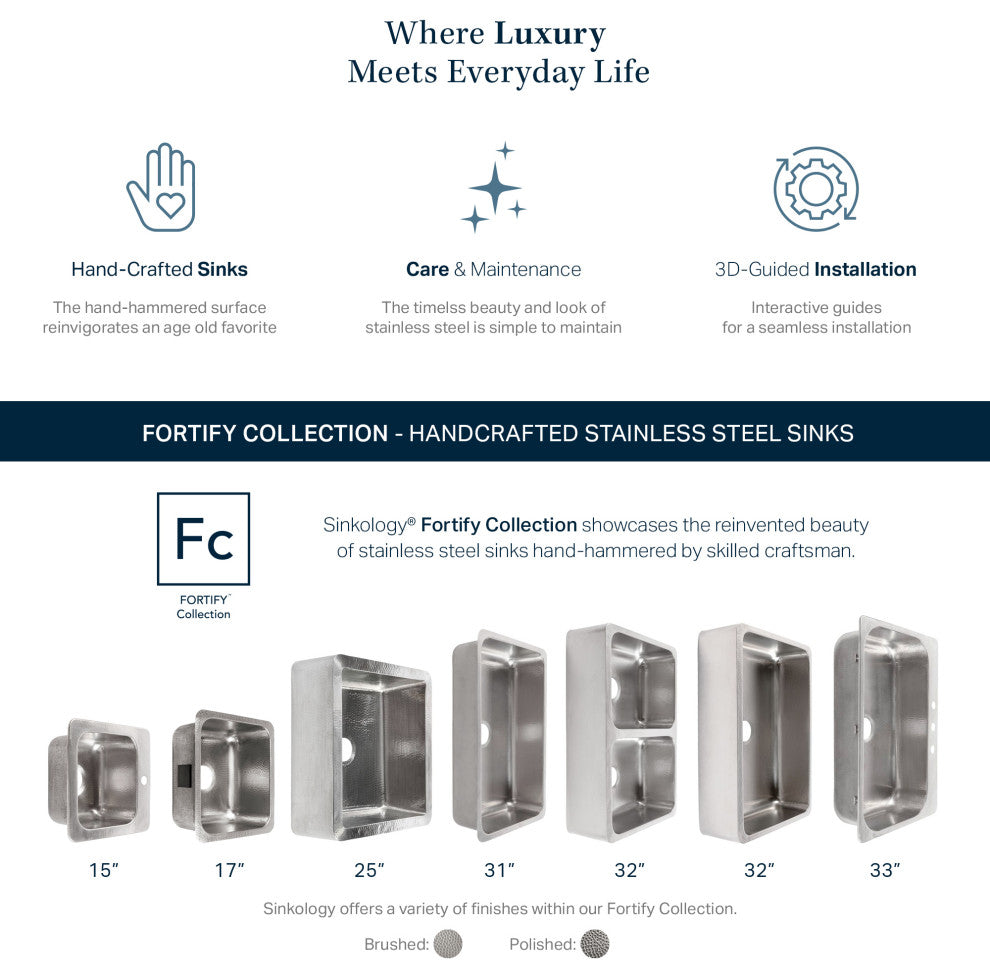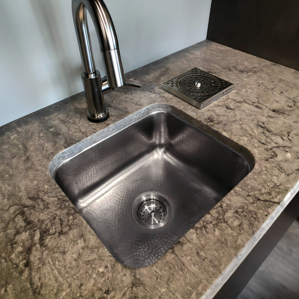 Even small rooms and spaces need big style. The Orwell undermount stainless steel kitchen sink is perfect for compact spaces like prep areas, laundry rooms, or tiny homes. The single bowl ensures maximum workspace for washing dishes or prepping meals - even in smaller areas. Our durable, stainless steel sinks are hand-hammered by skilled craftsman and protected by our lifetime warranty. Dimensions: 17" x 15" x 7.25" Compact design is perfect for a small kitchen, home bar, laundry room, or tiny homeUndermount style creates a seamless transition from sink to countertop Single bowl maximizes available spaceHand-hammered, 18-gauge stainless steel is protected by our lifetime warrantySound dampening pads reduce dish clatter, noise, and vibrationsBrushed Stainless Steel has a lightly matted look that hides scratches and fingerprints Recommended Products: Kitchen Sink Basket Strainer Drain in Stainless Steel (#TB35-03)Kitchen Sink Basket Strainer Drain in Matte Black (#TB35-06)Kitchen Sink Basket Strainer Drain in Satin Gold (#TB35-07)Kitchen Sink Disposal Flange Drain in Stainless Steel (#TD35-03)Kitchen Sink Disposal Flange Drain in Matte Black (#TD35-06)Kitchen Sink Disposal Flange Drain in Satin Gold (#TD35-07)Stainless Steel Care IQ Kit (#SARMOR-701)