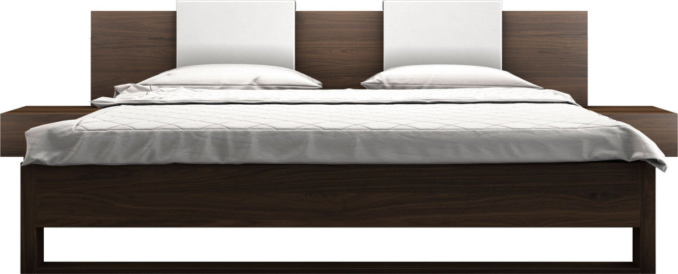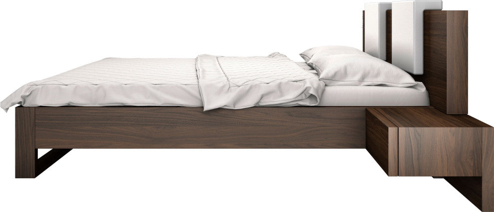 The Ossett platform bed offers an ideal way to infuse your bedroom sanctuary with a serene ambiance. Combining a sleek and inviting design, the Ossett boasts an expansive headboard that gracefully extends over two "floating" single-drawer nightstands, seamlessly integrated into the bed frame. The mattress rests snugly on a flat, sturdy pine platform with built-in air ventilation, ensuring a cleaner and healthier sleep environment. There''s no need for a box spring. Plus, it comes with two removable headrests upholstered in eco pelle material. The platform''s height measures 14 inches (with a 4-inch inset). Mattress not included