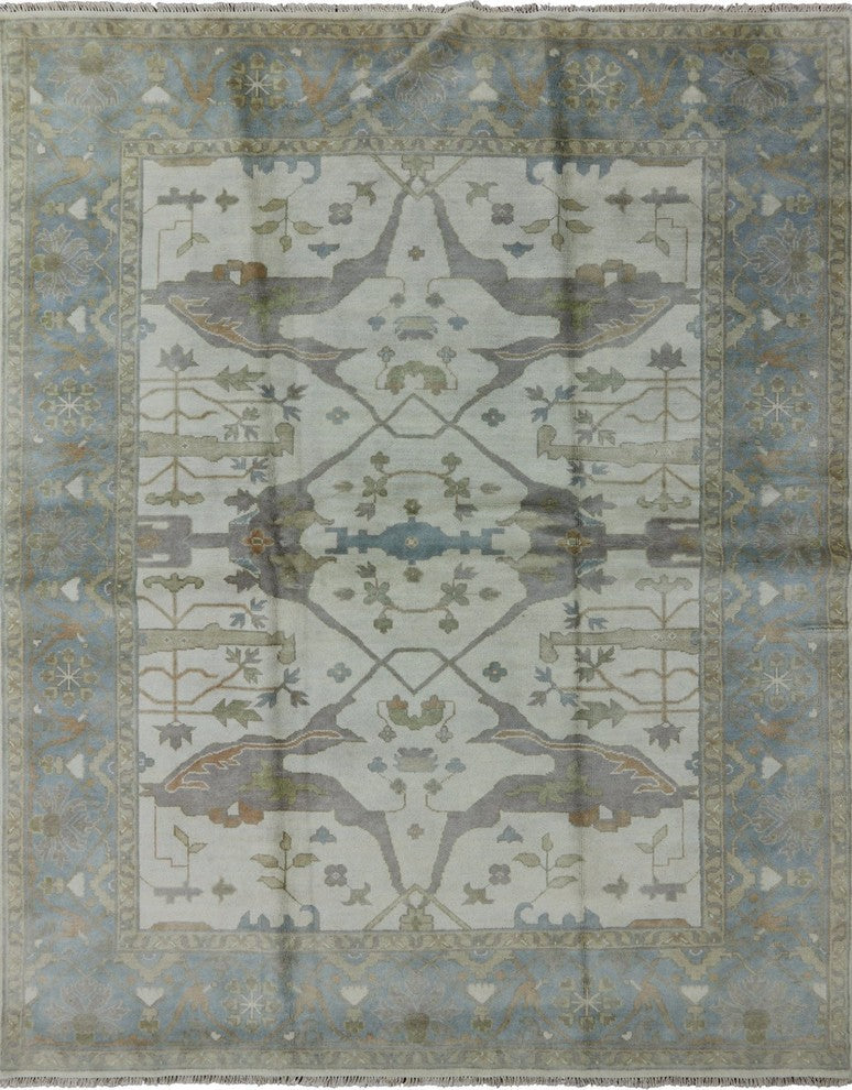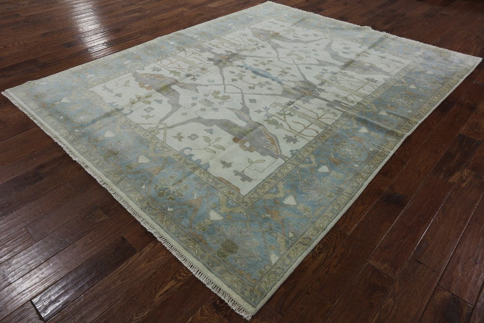 Oushak Ivory/Blue Border 8'x10' Geo-Floral Hand Knotted Wool Area Rug