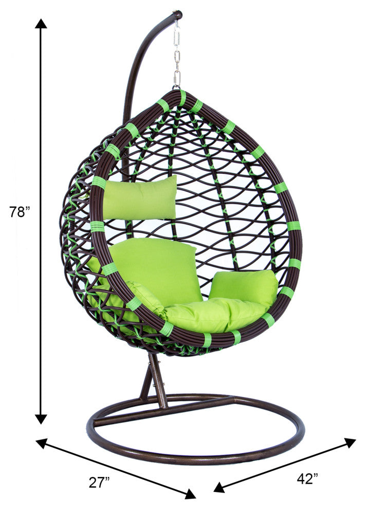 Item specification:.[DURABLE ALUMINUM FRAME]: Built with a high-quality, rust-resistant, and UV-resistant aluminum frame, this egg swing chair is perfect for long-lasting outdoor use on your patio, balcony, or garden..[HANDWOVEN WICKER DESIGN]: Crafted with precision by skilled artisans, the handwoven rattan wicker adds a touch of bohemian elegance and durability, making it ideal for both indoor and outdoor spaces..[COMFORTABLE REMOVABLE CUSHIONS]: Features outdoor-grade fabric cushions filled with soft, breathable cotton for ultimate comfort and relaxation. The removable cushions make cleaning and maintenance a breeze..[STURDY IRON STAND]: Supported by a strong and durable iron stand, this hanging egg chair ensures stability and safety while adding a modern touch to your outdoor lounge area..[EASY ASSEMBLY]: Designed for quick and simple assembly with clear instructions included, so you can set up your wicker swing chair and start enjoying your cozy relaxation space in no time.Item Dimensions:78" H x 42" W x 27" DAdjustable Seat Height 14 - 17"Stand Diameter 41. Chain Length 16"Weight: 60 lbs.Item Description:This fun egg-shaped porch swing chair was built to last in the outdoors with its strong durable iron frame it will be perfect for all weathers. Sit in luxurious comfort while surrounded by the peace and beauty of your backyard, or enjoy a good book indoors with this comfortable hanging chair.
