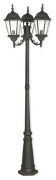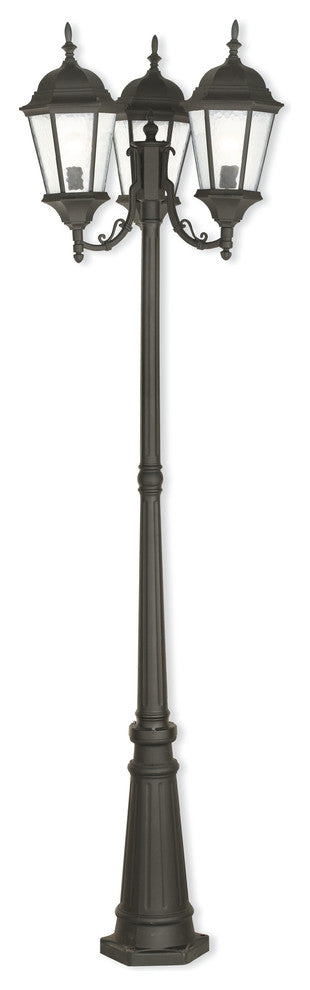 A decorative top and arm are paired with a simple six-sided frame in this textured black and clear water glass outdoor multi head post lanterns are constructed of cast aluminum.