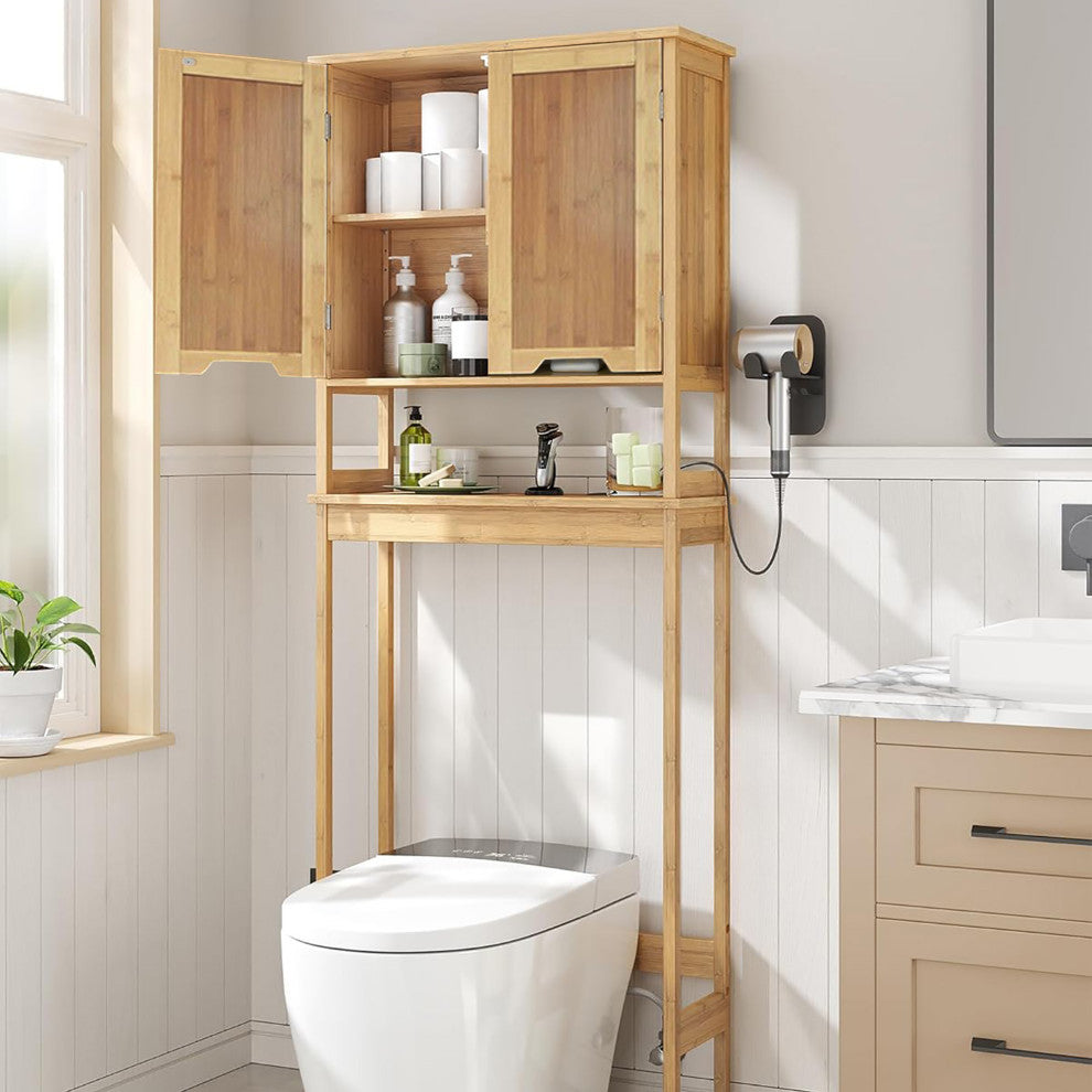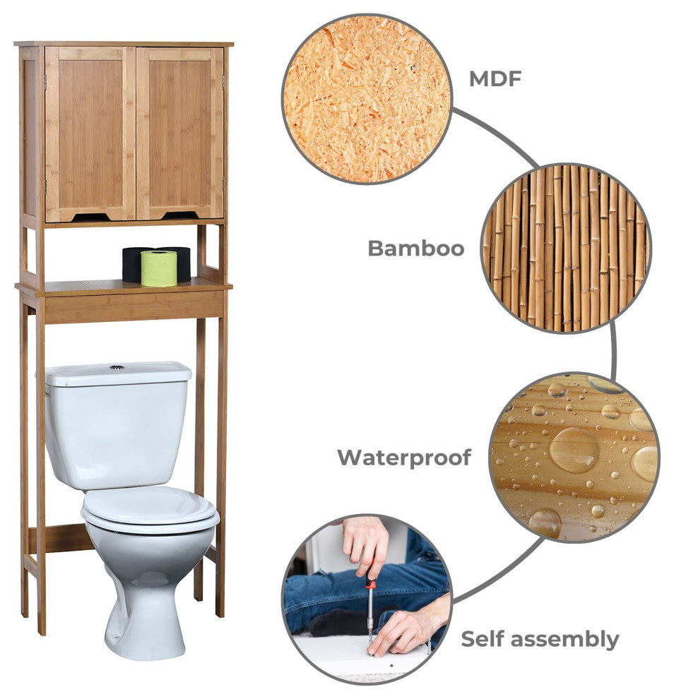 • SPACE-SAVING DESIGN: Utilizes the space above the toilet, maximizing bathroom storage without occupying floor space. Dimensions: 68.4 H x 23.10 L x 8.10 W• BATHROOM CABINET: Features double magnetic doors and a fixed shelf, providing ample space for bathroom essentials. An open shelf beneath the enclosed cabinet is ideal for decorative items• FREESTANDING OVER TOILET STORAGE: Sturdy freestanding design fits over standard toilets, offering a stable and functional storage solution. Wall anchor supplied for stability• DURABLE MATERIAL: Constructed from durable bamboo and MDF with a smooth natural finish, our over-the-toilet storage ensures longevity while enhancing your bathroom"™s decor• NATURAL DESIGN: The wood finish and cut-out handles complement any bathroom decor, offering a timeless and natural look• EASY ASSEMBLY: Includes all necessary hardware and straightforward instructions for a quick and hassle-free assembly experienceTransform your bathroom with this Over Toilet Storage Cabinet, designed to maximize storage in tight spaces. This practical unit features a solid bamboo and MDF frame with a smooth natural finish that suits a wide range of bathroom styles, from modern to classic. Moreover, the tall, narrow structure of our bathroom furniture is ideal for placing over standard toilets, utilizing otherwise wasted space effectively. In addition, the double-door design opens to reveal two spacious compartments for storing towels, toiletries, and other essentials. The doors are equipped with magnetic closures for secure and easy access. Also, you can easily keep everything neatly organized and within reach on the open shelf. Furthermore, easy to assemble, this above toilet storage cabinet comes with detailed instructions and all the hardware you need for quick installation, saving you time and effort. Its compact footprint makes it a smart choice for smaller bathrooms or guest washrooms where space is at a premium. Designed with both style and function in mind, this bathroom storage solution offers an elegant way to maintain a tidy and organized bathroom environment. Ideal for those who need additional storage without compromising on style, it"™s the perfect blend of practicality and design for any home.