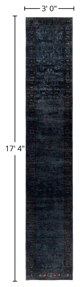 Overdyed area rugs blend vintage charm with bold, modern colors. This process involves taking distressed or faded traditional and antique rugs and saturating them with vibrant, monochromatic dye. This technique enhances the texture of the rugs while preserving the intricate patterns underneath. The result is a striking combination of old and new, with rich hues like deep blue, purple, or bright red. These rugs are perfect for eclectic and contemporary spaces, adding an artistic touch and serving as a dynamic focal point in any room.FeaturesHandcrafted by our team of experts in PakistanExceptional durability with 100 knots per inch constructionConstructed of 100% wool for a soft and cozy feelConvenient 3'' 0" x 17'' 4" dimensions offer the perfect balanced and inviting rug presenceNote that slight color variations may occur due to monitor differences. Embrace the individuality of each rug with minor variations in lengths, widths, and patternsDimensions:Area RugLength: 208 inchesWe believe that a beautiful room starts from the ground up. That is what inspired our founders to start selling hand-knotted rugs over 40 years ago. Since then, our passion for well-designed, impeccably hand-made rugs has never wavered.Experience - With more than 40 years in the rug business, our knowledge of premium hand-knotted rugs is exceptional.Quality - Our focus is on hand-knotted rugs and only hand-knotted rugs. At a minimum, it takes months to complete each rug by hand - that level of workmanship means our rugs are made to last.Variety - Our selection includes styles, sizes, and colors for every space and taste.