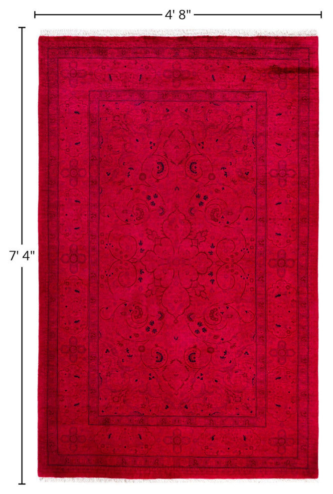 Overdyed area rugs blend vintage charm with bold, modern colors. This process involves taking distressed or faded traditional and antique rugs and saturating them with vibrant, monochromatic dye. This technique enhances the texture of the rugs while preserving the intricate patterns underneath. The result is a striking combination of old and new, with rich hues like deep blue, purple, or bright red. These rugs are perfect for eclectic and contemporary spaces, adding an artistic touch and serving as a dynamic focal point in any room.FeaturesHandcrafted by our team of experts in PakistanExceptional durability with 256 knots per inch constructionConstructed of 100% wool for a soft and cozy feelConvenient 4'' 8" x 7'' 4" dimensions offer the perfect balanced and inviting rug presenceNote that slight color variations may occur due to monitor differences. Embrace the individuality of each rug with minor variations in lengths, widths, and patternsDimensions:Area RugLength: 88 inchesWe believe that a beautiful room starts from the ground up. That is what inspired our founders to start selling hand-knotted rugs over 40 years ago. Since then, our passion for well-designed, impeccably hand-made rugs has never wavered.Experience - With more than 40 years in the rug business, our knowledge of premium hand-knotted rugs is exceptional.Quality - Our focus is on hand-knotted rugs and only hand-knotted rugs. At a minimum, it takes months to complete each rug by hand - that level of workmanship means our rugs are made to last.Variety - Our selection includes styles, sizes, and colors for every space and taste.