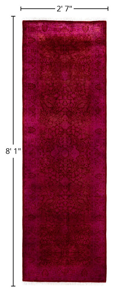 Overdyed area rugs blend vintage charm with bold, modern colors. This process involves taking distressed or faded traditional and antique rugs and saturating them with vibrant, monochromatic dye. This technique enhances the texture of the rugs while preserving the intricate patterns underneath. The result is a striking combination of old and new, with rich hues like deep blue, purple, or bright red. These rugs are perfect for eclectic and contemporary spaces, adding an artistic touch and serving as a dynamic focal point in any room.FeaturesHandcrafted by our team of experts in PakistanExceptional durability with 256 knots per inch constructionConstructed of 100% wool for a soft and cozy feelConvenient 2'' 7" x 8'' 1" dimensions offer the perfect balanced and inviting rug presenceNote that slight color variations may occur due to monitor differences. Embrace the individuality of each rug with minor variations in lengths, widths, and patternsDimensions:Area RugLength: 97 inchesWe believe that a beautiful room starts from the ground up. That is what inspired our founders to start selling hand-knotted rugs over 40 years ago. Since then, our passion for well-designed, impeccably hand-made rugs has never wavered.Experience - With more than 40 years in the rug business, our knowledge of premium hand-knotted rugs is exceptional.Quality - Our focus is on hand-knotted rugs and only hand-knotted rugs. At a minimum, it takes months to complete each rug by hand - that level of workmanship means our rugs are made to last.Variety - Our selection includes styles, sizes, and colors for every space and taste.