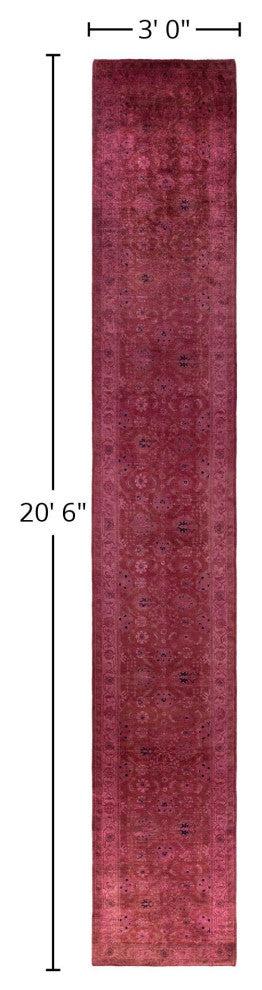 Overdyed area rugs blend vintage charm with bold, modern colors. This process involves taking distressed or faded traditional and antique rugs and saturating them with vibrant, monochromatic dye. This technique enhances the texture of the rugs while preserving the intricate patterns underneath. The result is a striking combination of old and new, with rich hues like deep blue, purple, or bright red. These rugs are perfect for eclectic and contemporary spaces, adding an artistic touch and serving as a dynamic focal point in any room.FeaturesHandcrafted by our team of experts in PakistanExceptional durability with 256 knots per inch constructionConstructed of 100% wool for a soft and cozy feelConvenient 3'' 0" x 20'' 6" dimensions offer the perfect balanced and inviting rug presenceNote that slight color variations may occur due to monitor differences. Embrace the individuality of each rug with minor variations in lengths, widths, and patternsDimensions:Area RugLength: 246 inchesWe believe that a beautiful room starts from the ground up. That is what inspired our founders to start selling hand-knotted rugs over 40 years ago. Since then, our passion for well-designed, impeccably hand-made rugs has never wavered.Experience - With more than 40 years in the rug business, our knowledge of premium hand-knotted rugs is exceptional.Quality - Our focus is on hand-knotted rugs and only hand-knotted rugs. At a minimum, it takes months to complete each rug by hand - that level of workmanship means our rugs are made to last.Variety - Our selection includes styles, sizes, and colors for every space and taste.