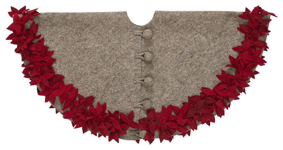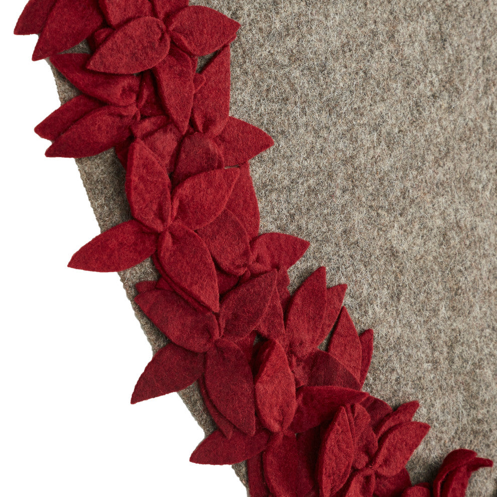 Our overlapping flowers tree skirt features a natural tone with a maroon-colored floral border of hand-cut flower petals and sturdy oversized button closures. Arcadia Home designs are handmade. Each design is as unique as the artisan who creates it. 100% hand-felted wool.Diameter: 64"