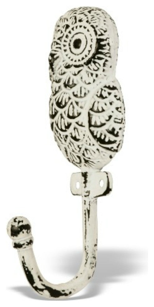 Charming cast iron Owl wall hook in a white distressed finish. The hook has two holes for easy and secure mounting. Also available in antique brass finish. Mounting Hardware: Included Hook Dimensions: 6"� Height x 2.4"� Width x 2.2"� Depth