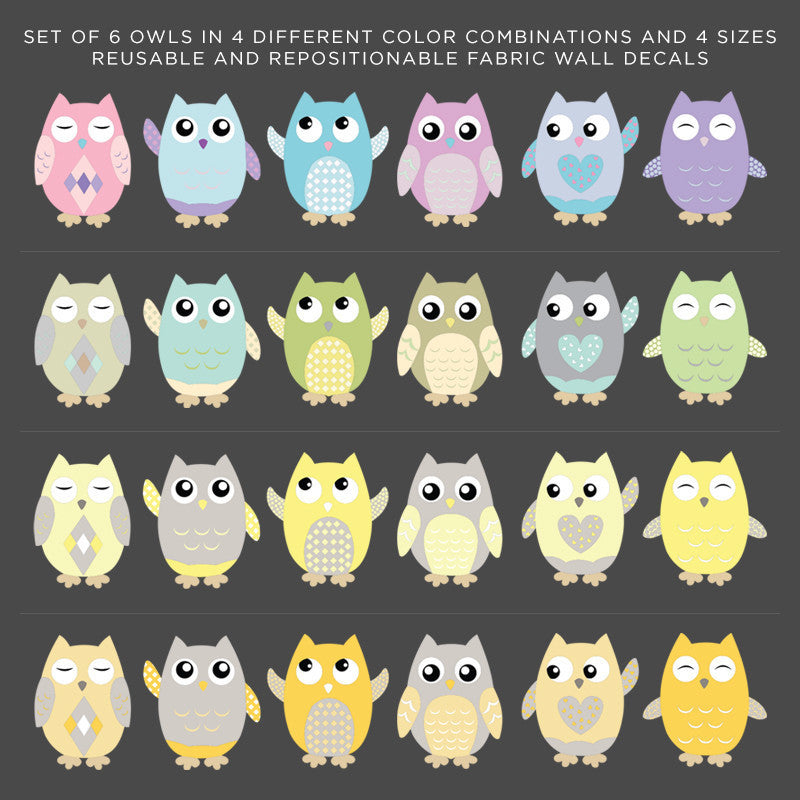 These adorable Owl Wall Decals come in a set of 6 owls in a variety of different colors and patterns. The decals are made from a high quality fabric material that is reusable and repositionable. Available in 4 different sizes. There are 4 color options as well!