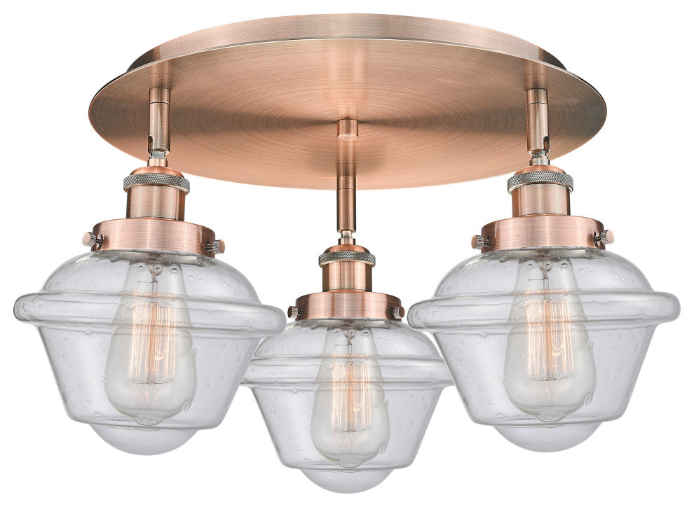 Oxford-3 Light 18" Flush Mount-Antique Copper, Seedy Glass Shade