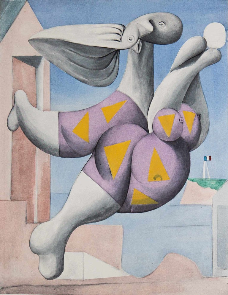 Pablo Picasso Limited Edition Lithograph. Titled: Bagnante Che Cioca Al Pallone. 1932. Size 11 x 15 in. (Framed: 18 x 19 in). Sur les presses de Silvana Editoriale D''Arte, Milano. 1955 This is a Limited Edition Lithograph (30/200) on woven paper. This lithograph is of a Limited Edition out of 200, this one being no. 30. and will be accompanied with Gallery Certificate of Authentication .