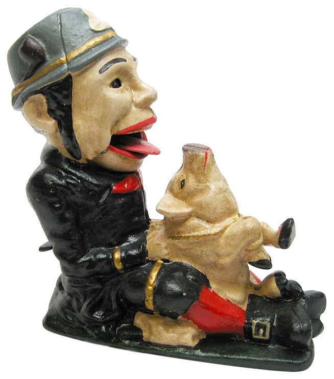 The Irish pig of prosperity kicks your coin forward as the tongue of Paddy the Leprechaun reaches out to catch it in this ingenious - and highly collectible - mechanical toy bank. Our Design Toscano replica novelty, originally designed by James H. Bowen of Philadelphia and created by the J & E Stevens Company of Cromwell, Connecticut in 1882, is a hand-painted, heavy cast iron, classic vintage collectors replica cast from an antique bank mold with authentic die-cast metal construction. Metal turn stopper allows for coin removal. 7"Wx3"Dx8"H. 7 lbs.