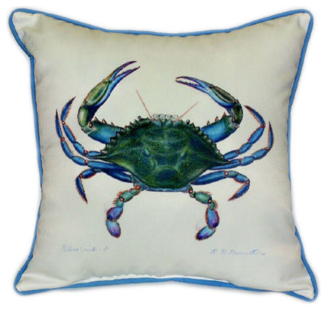 This stunning pair of Male Blue Crab print indoor / outdoor pillows are from Betsy Drake Interiors. Proudly made in the USA, each pillow features a wonderful watercolor print of a male blue crab, based on original artwork by artist R.B. Hamilton. Each pillow measures 18 inches tall, 18 inches long, has a 100% polyester cover, which resists fading and wear, giving you years of use, and is stuffed with polyester. Recommended care instructions are to spot clean, only.