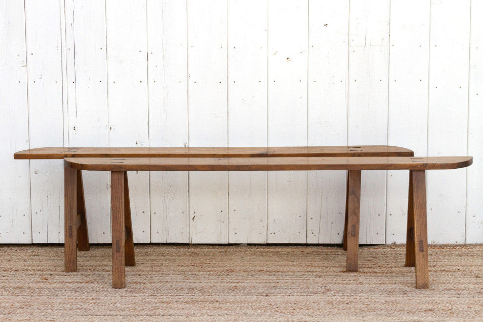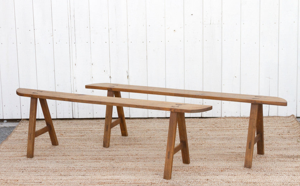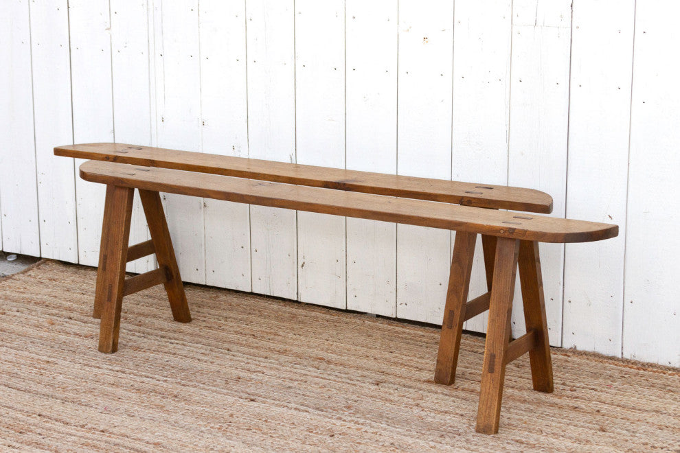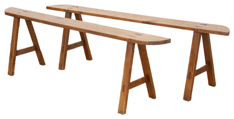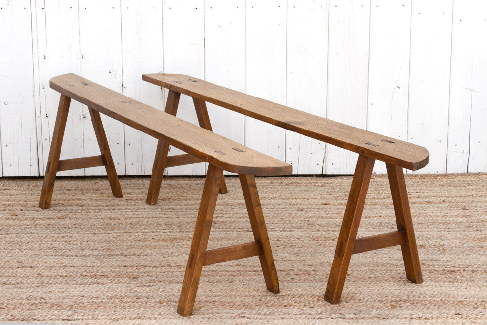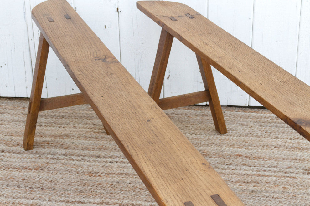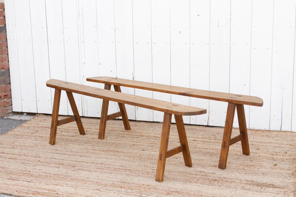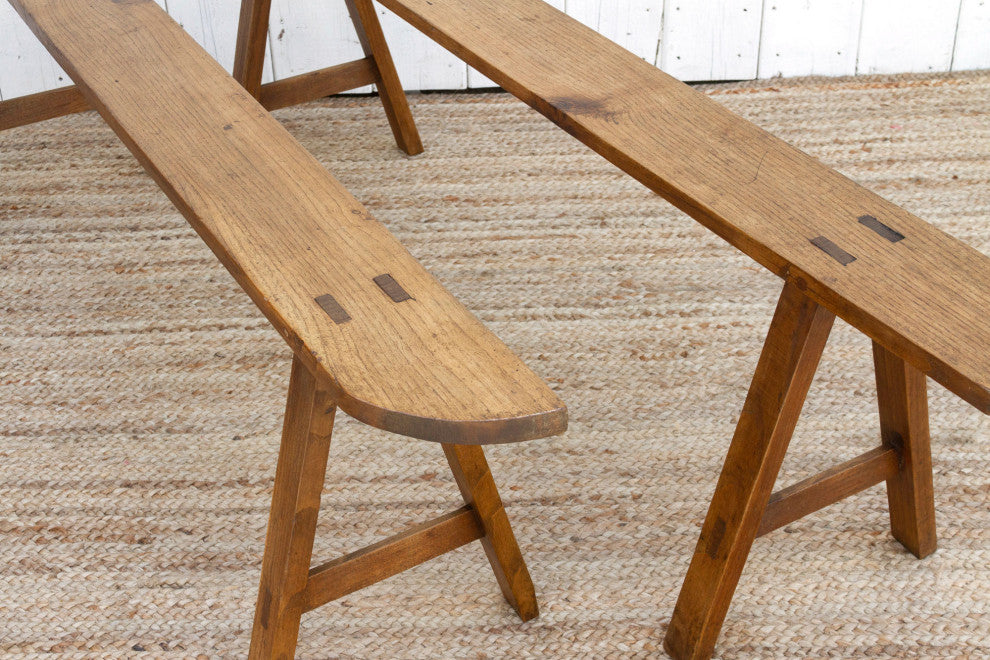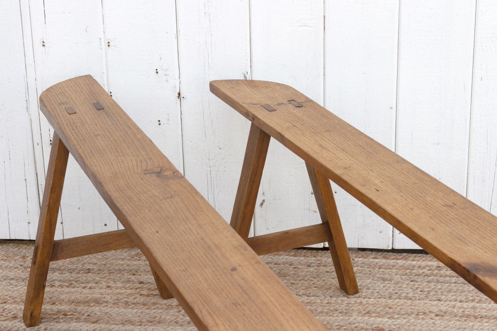 These charming French slim benches date back to the early 20th century and come as a pair. This set of 2 French farmhouse benches are crafted from oak and feature a beautiful grain across the top with a semi-oxidize wax patina.These antique rustic benches have a 6"� slim "œ D"� shaped top and are supported by sturdy "A"-shaped joint legs.