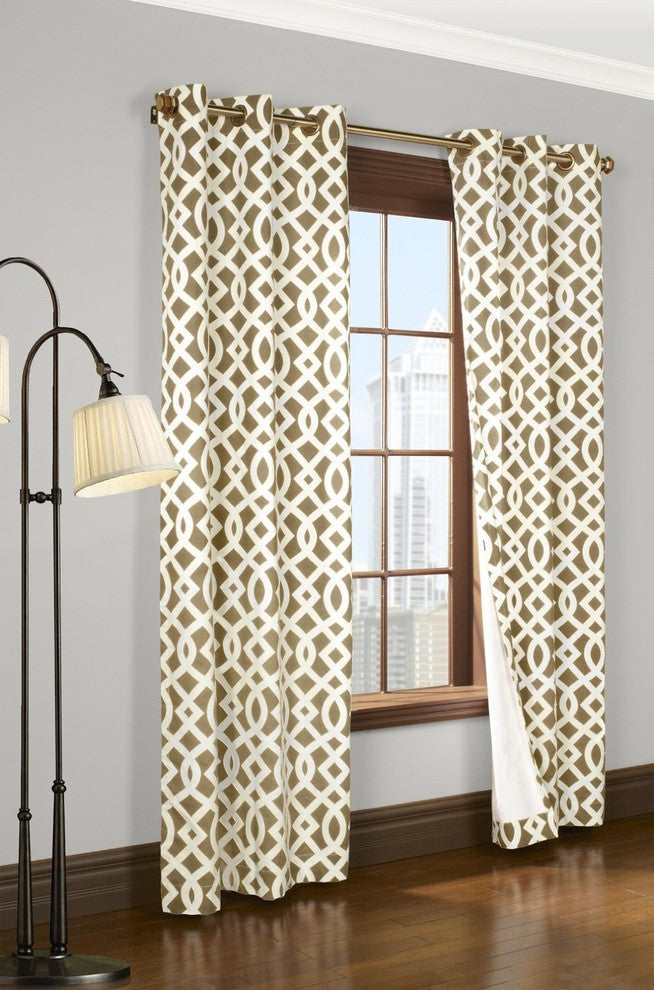 Trellis Thermalogic Khaki 80" X 63" Grommet Top Curtain Pair. Each package comes with two grommet top room darkening panels measuring 40" Wide each. These curtains are thermal insulated, room darkening and are energy efficient. The curtains insulating qualities keep your house warm in the winter and cool in the summer and can save on energy costs. These curtains block out a majority of the light but are not considered blackout curtains. They feature a modern stylish geometric trellis pattern that is the perfect touch for that retro modern look. Made in China.