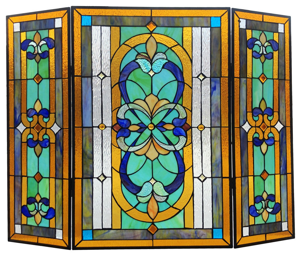 PALACE Tiffany-Style 3-Piece Folding Victorian Glass Fireplace Screen, 40"