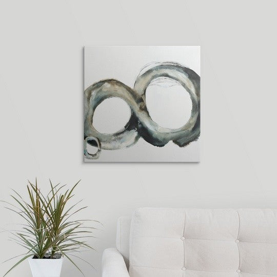 Gallery-wrapped canvas entitled, "Paleo II".Abstract painting in contrasting neutral tones of a figure eight, lying horizontally on its side, with a tiny circle that partially overlaps the front of it, on a solid neutral background.Our wrapped canvases feature a proprietary design that prevents warping or sagging over time. By using archival inks and artist-grade canvas, our premium canvases are sure to add that extra touch to any space. Lastly, our canvases are finished with a closed back that incorporates pre-installed hanging hardware for easy installation.