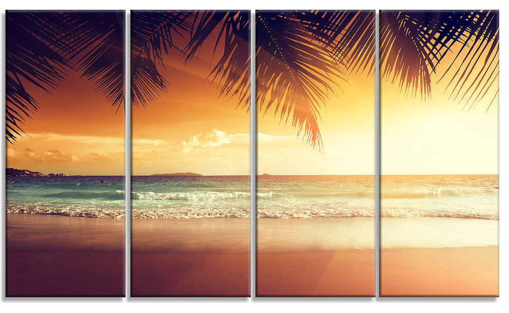 "Palm Leaves On Caribbean Seashore" Modern Seashore Wall Art, 4 Panels, 48"x28"