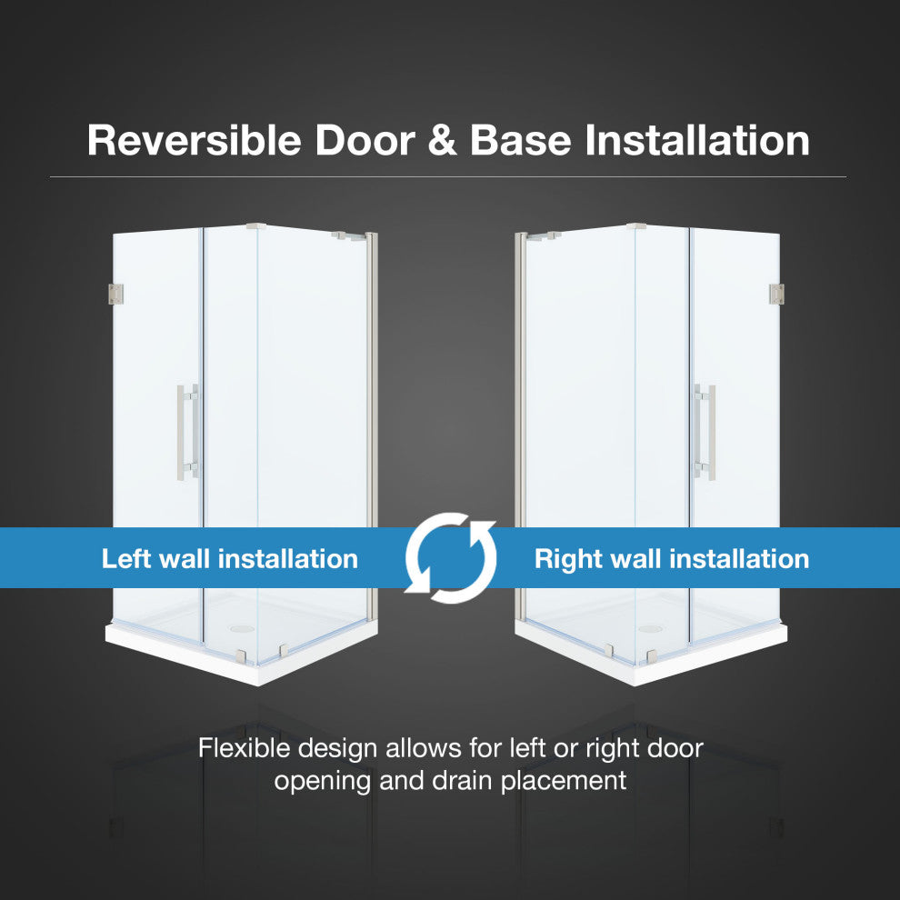 The Panama 36 in. frameless hinge shower door kit from OVE Decors has a modern, minimalist enclosure design that pairs high functionality with contemporary style. The set comes with premium quality hardware, complete with a sleek satin nickel finish, and includes a 23 in. wide door panel, 10 in. wide inline panel, 36 in. wide side panel and 36 in. x 36 in. x 2 3/4 in. shower base pan, ideal for a corner installation. The glass door panel is made from premium 8mm (5/16) thick certified tempered glass, and features high quality magnetic door strips and engineered hardware that ensure smooth opening and closing and no leaks. The center-drain shower base is made of premium fiberglass-reinforced acrylic and has a slip-minimizing textured surface and easy-to-clean construction.